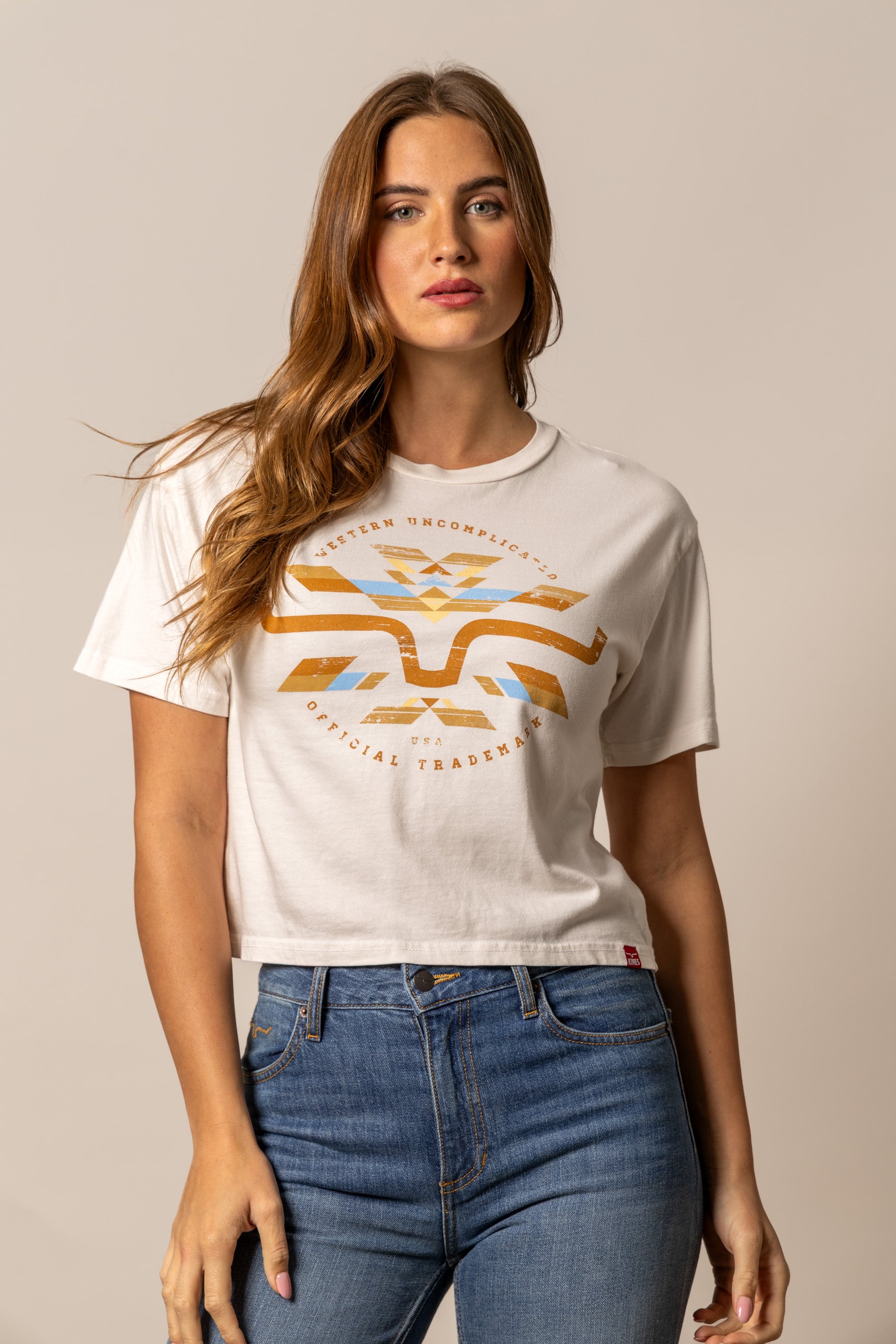 The Abiquiu Cropped Tee blends modern cowgirl style with bold western graphics. Featuring a striking geometric design across the chest. this tee is made from soft 100% cotton for all-day comfort. The boxy. cropped fit creates a contemporary silhouette that’s easy to pair with high-rise jeans or shorts. Available in versatile colors. the Abiquiu is perfect for casual days. concerts. and everyday ranch life.