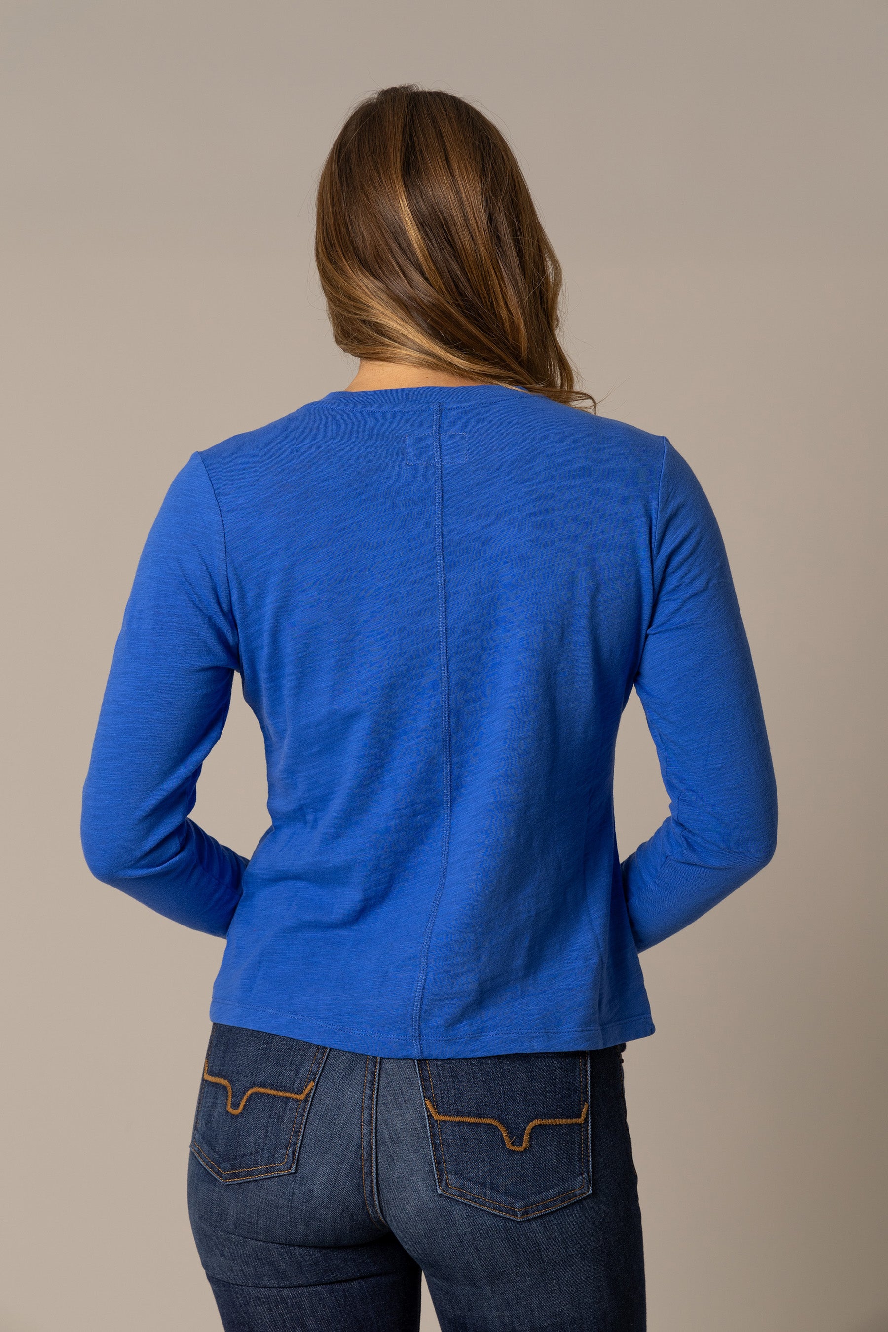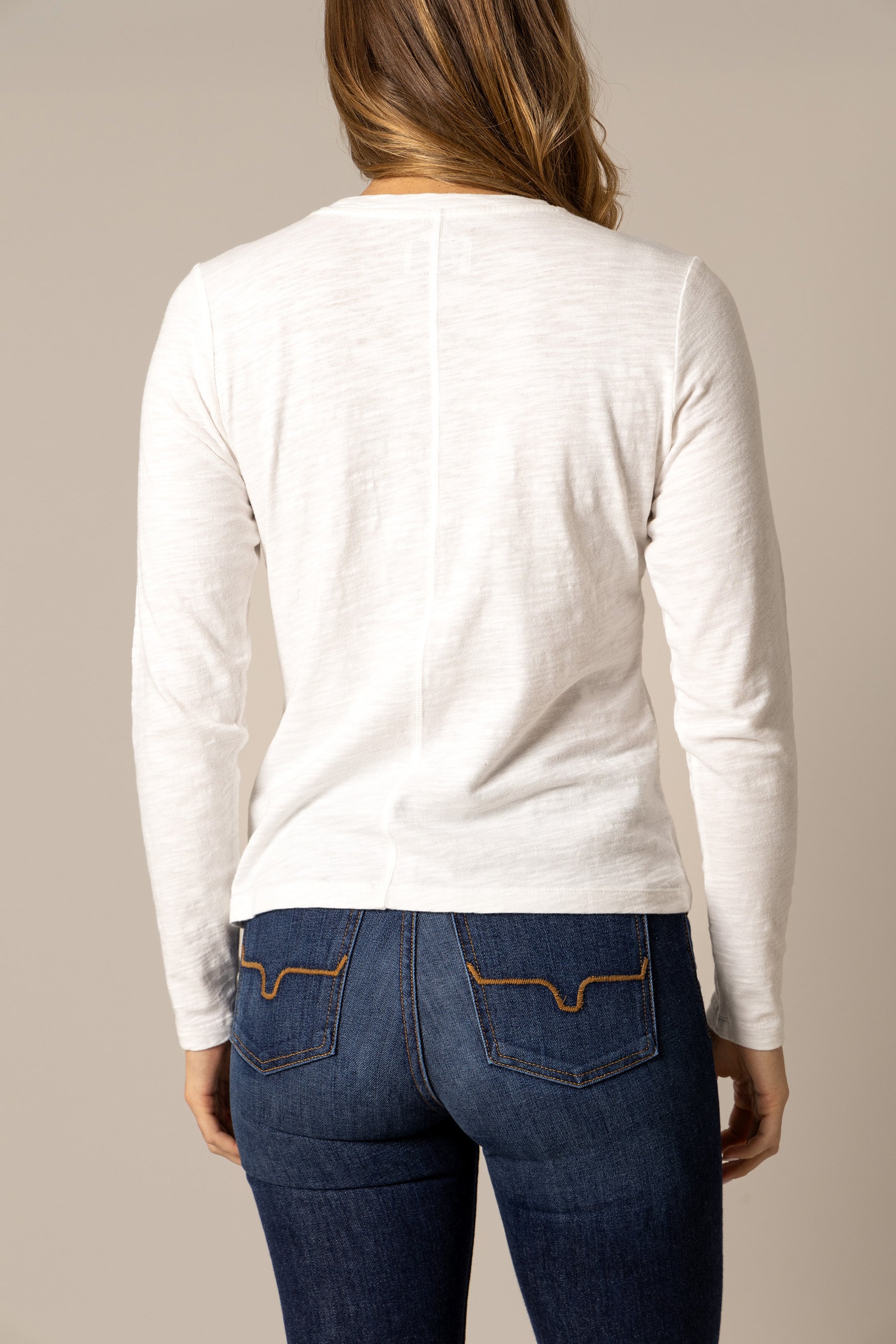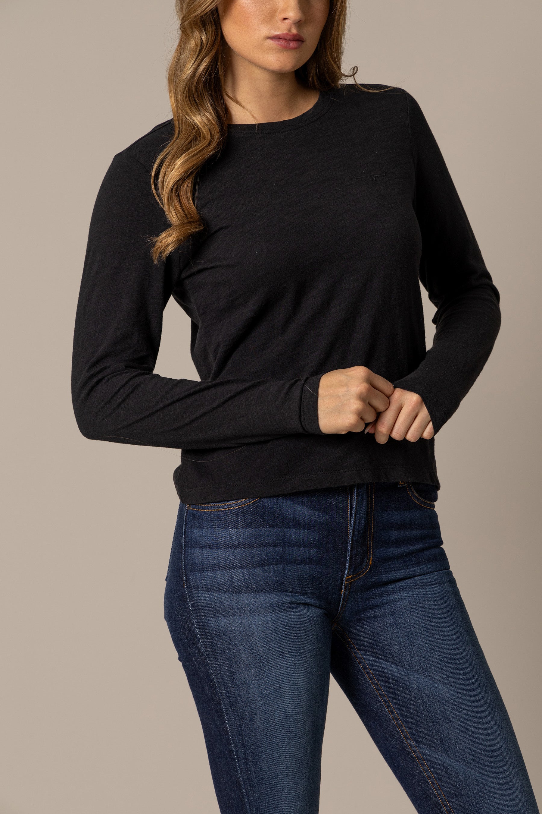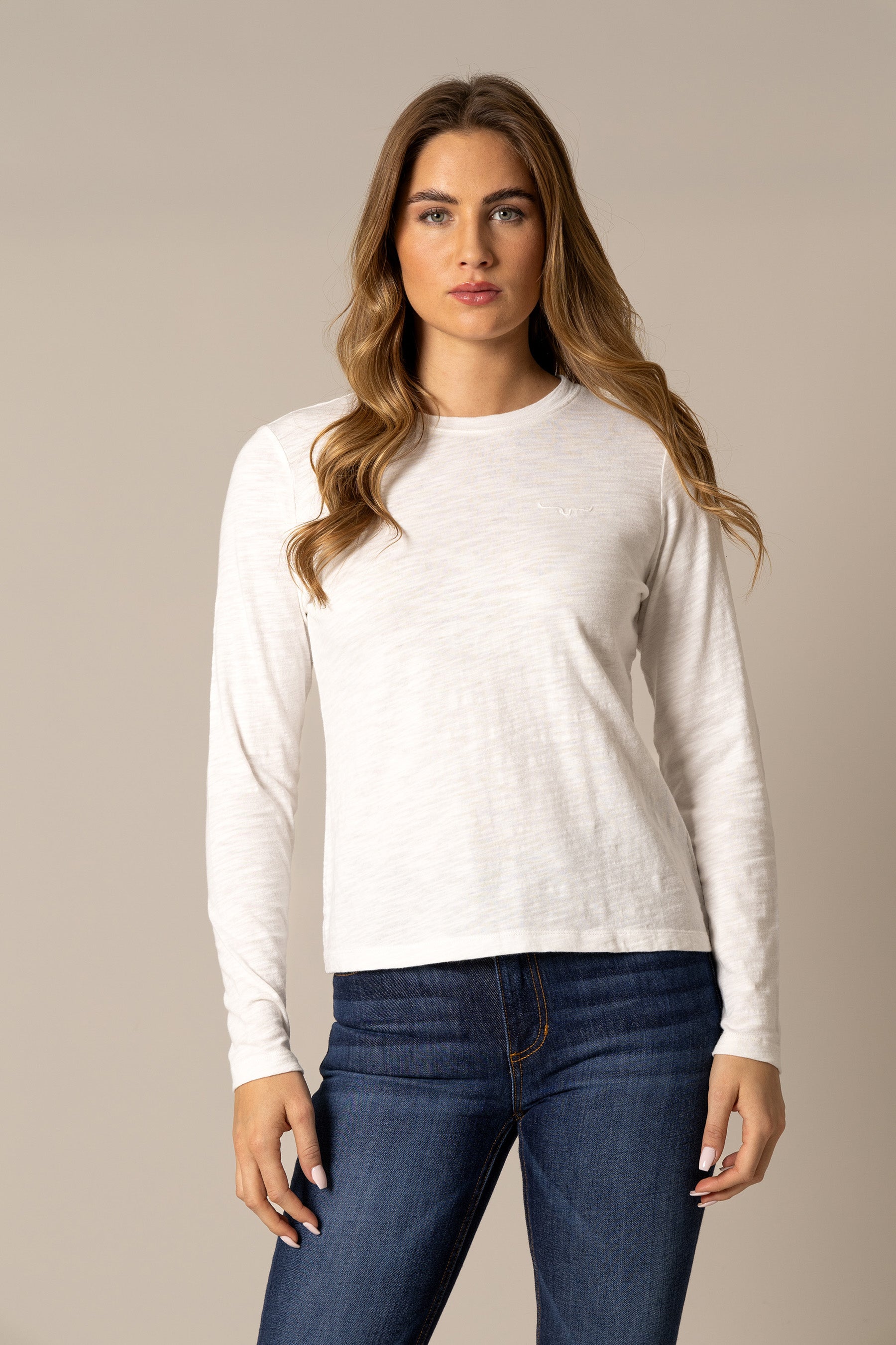 The Ainsley Long Sleeve Tee is a versatile essential for any wardrobe. from workwear to city style. Crafted from 100% soft cotton. this tee is comfortable and easy to wear. The contrasting seam color adds a subtle pop. while the small yet iconic longhorn logo at the front embodies the Kimes Ranch spirit. Layer it under your favorite jacket or wear it solo with jeans for a classic look. This tee is your go-to piece for any occasion.