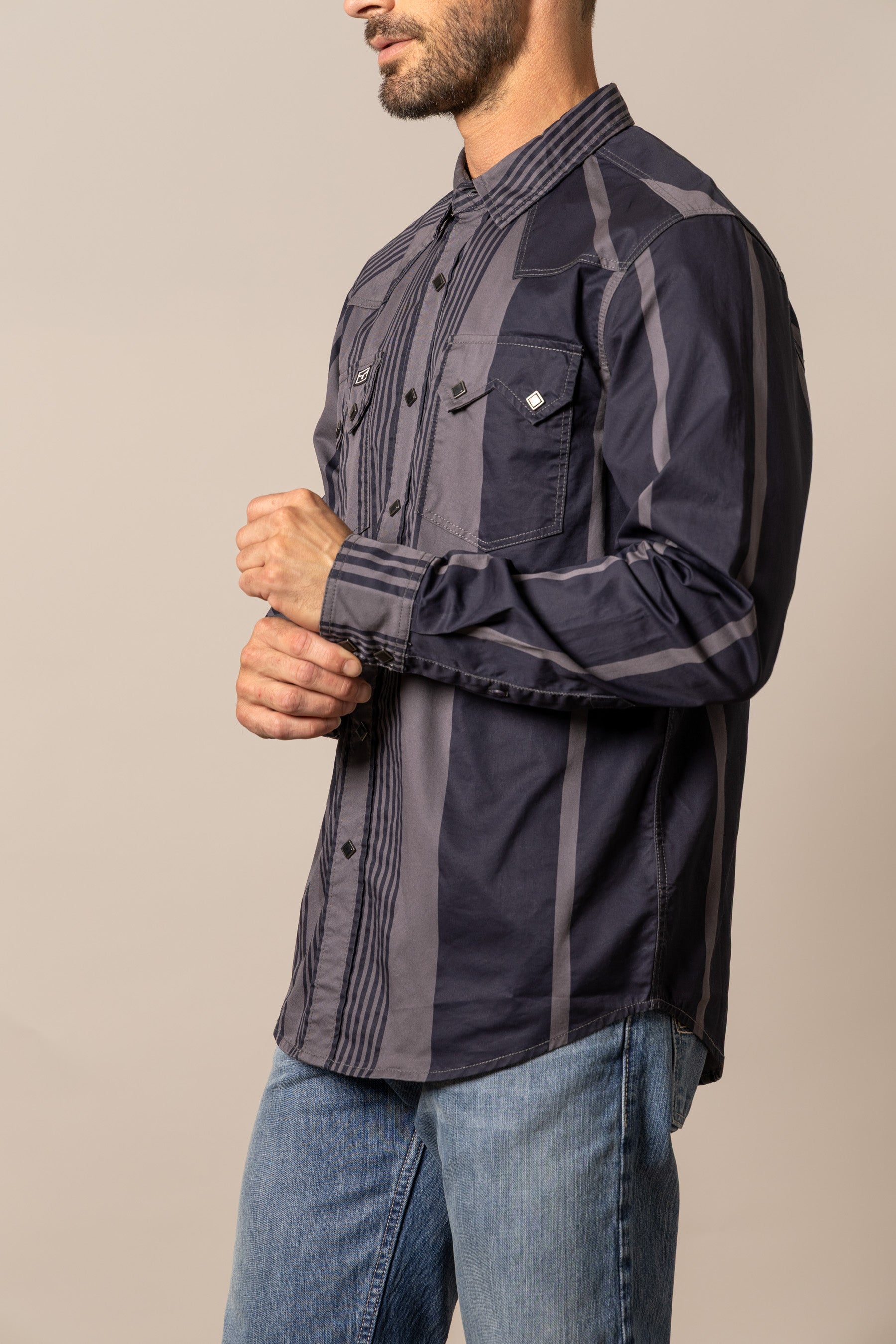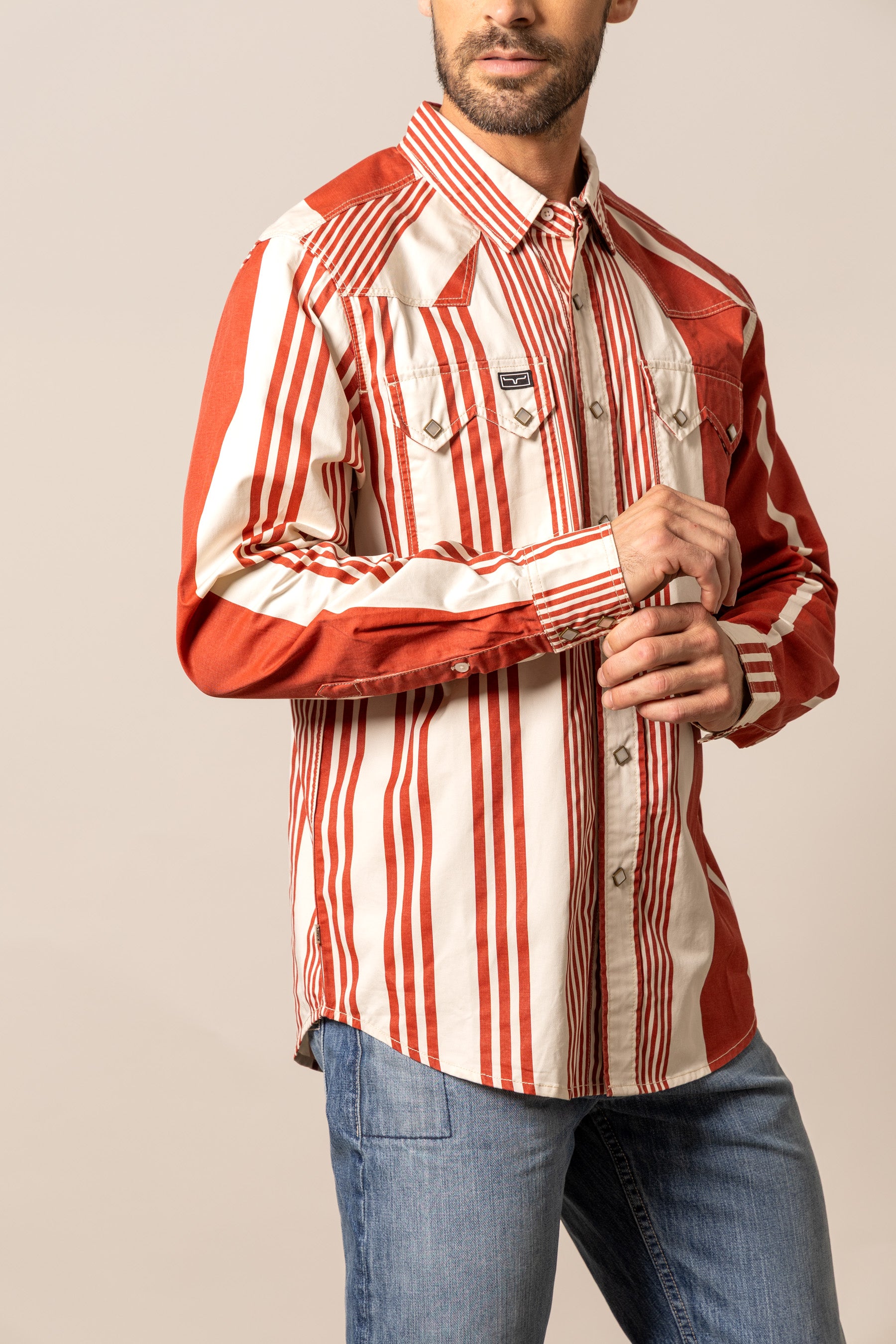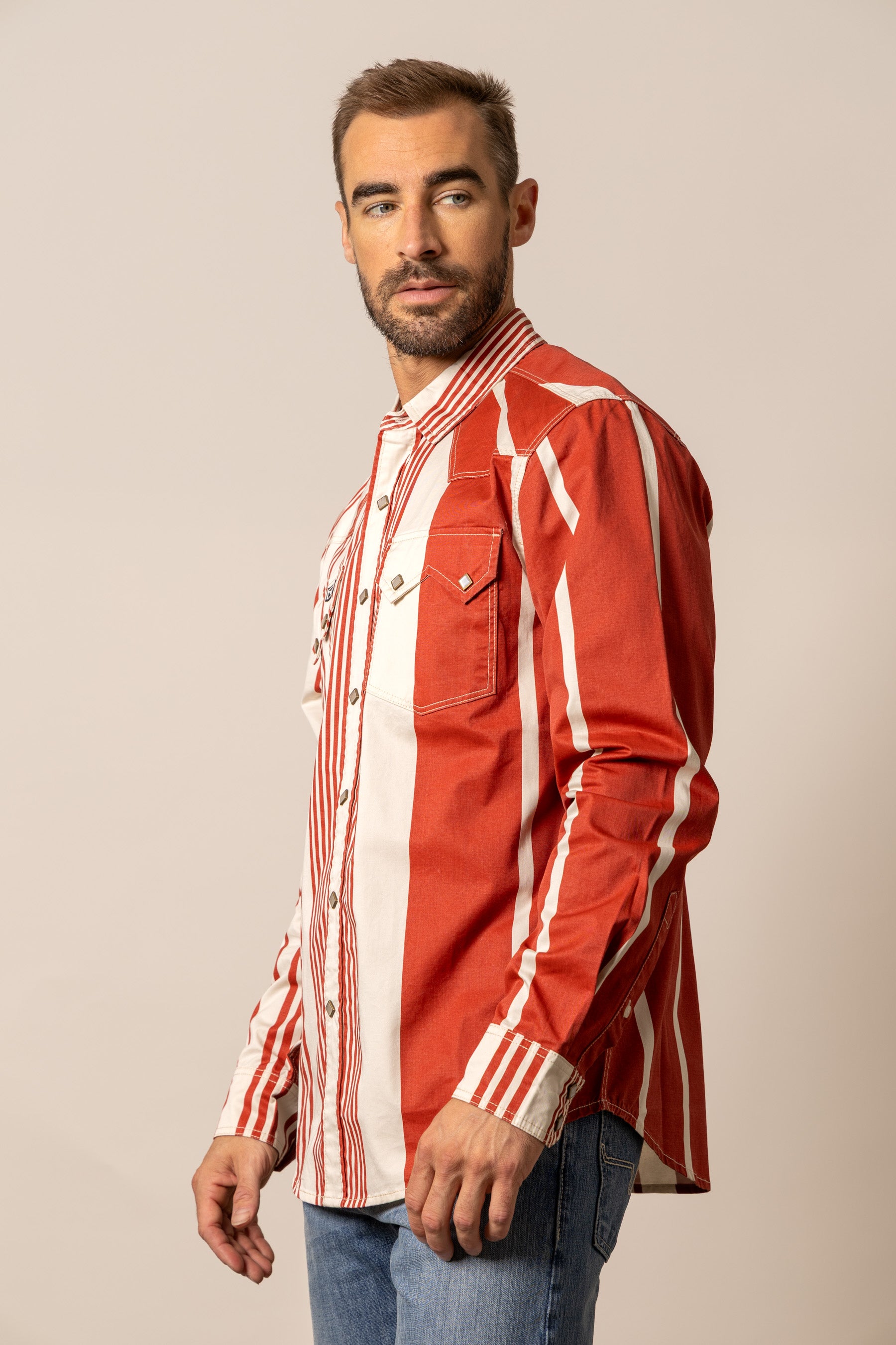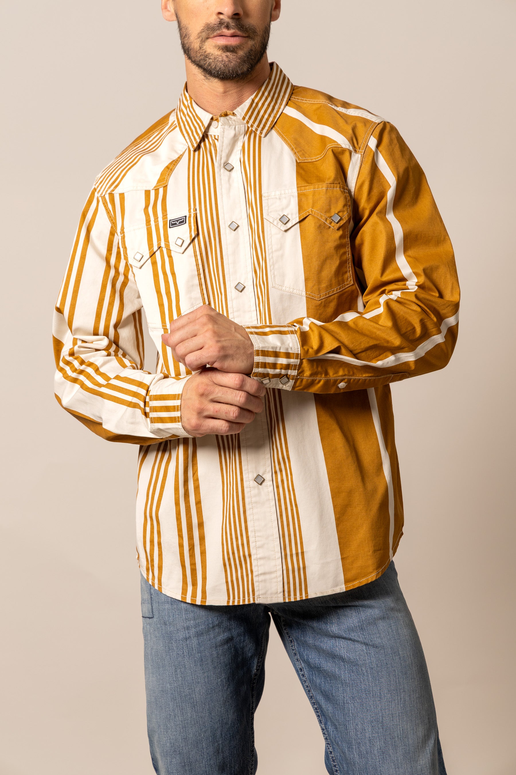 Channel your inner 90s cowboy with the Bandit button down. This vintage-inspired piece captures the essence of rustic charm. Featuring bold popper stripes that evoke a classic western aesthetic. it’s a statement shirt that commands attention. A traditional western yoke and iconic twin peaks flap pockets complete the authentic look. Crafted for comfort and durability. this shirt is as tough as it is stylish. The Bandit is a must-have for any modern cowboy.