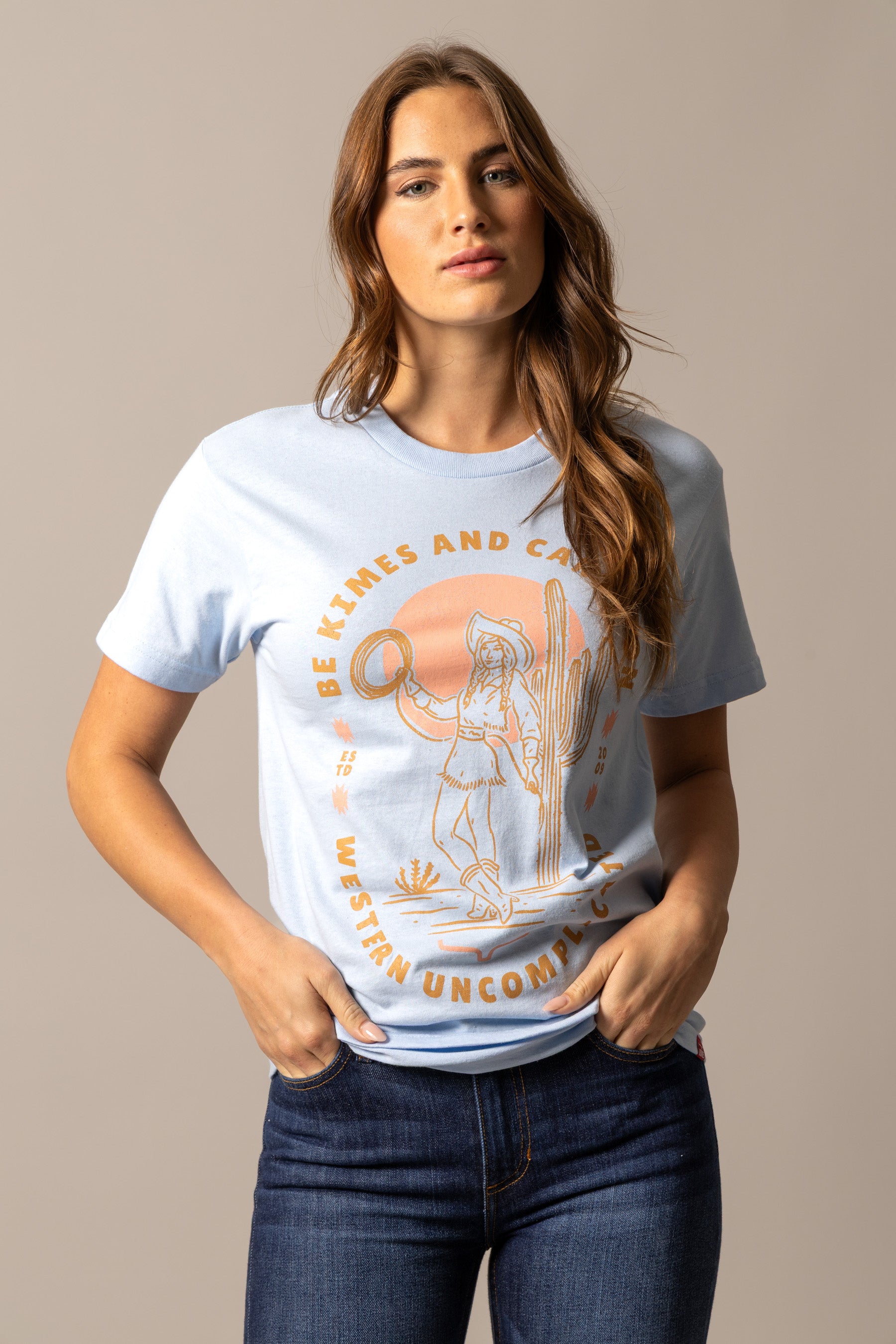 The Be Kimes Tee celebrates the heart of the West—resilience. grit. and the freedom to live boldly. Featuring a desert-inspired graphic of a cowgirl embracing the Western lifestyle across the same rugged landscape Kimes Ranch calls home. this tee embodies authentic Western spirit.