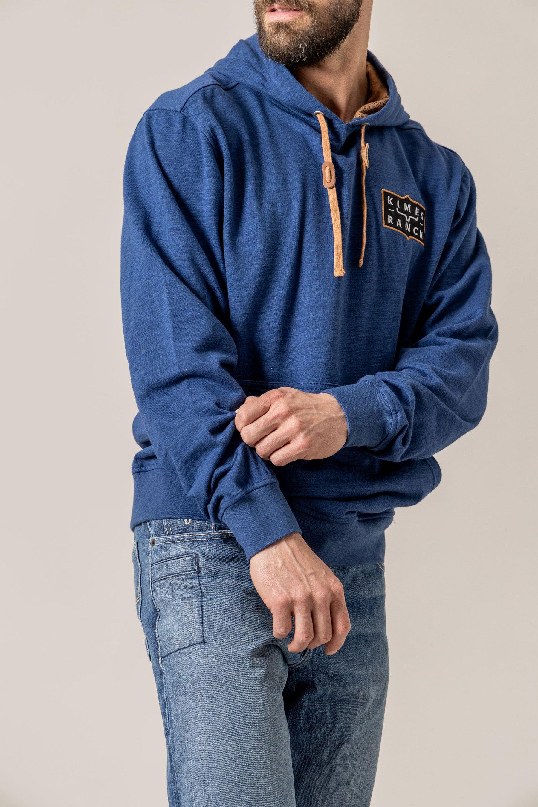 This hoodie is meant to keep you warm and comfortable all day long. thanks to the slub french terry. The full. adjustable hood is lined in a contrasting bandana pattern for added style. The front pouch pocket keeps essentials close and hands warm. A Kimes Ranch logo patch is presented boldly at the front.