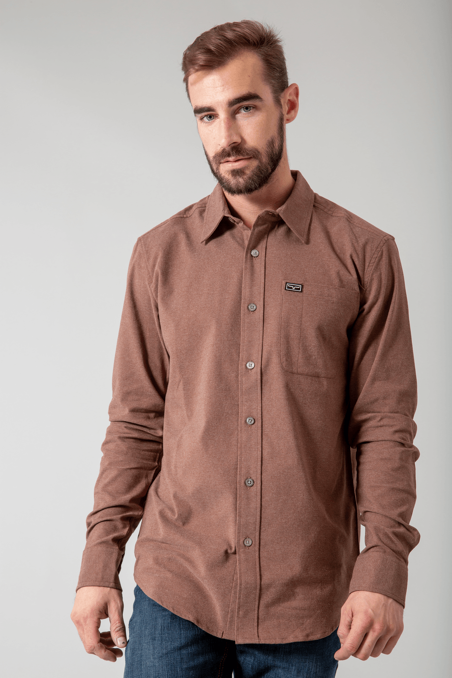 DetailsMen’s Long Sleeve Heather Flannel Solid Shirt in Technical Coolmax Fabric. Single Pocket. and Tech Patch on Pocket.