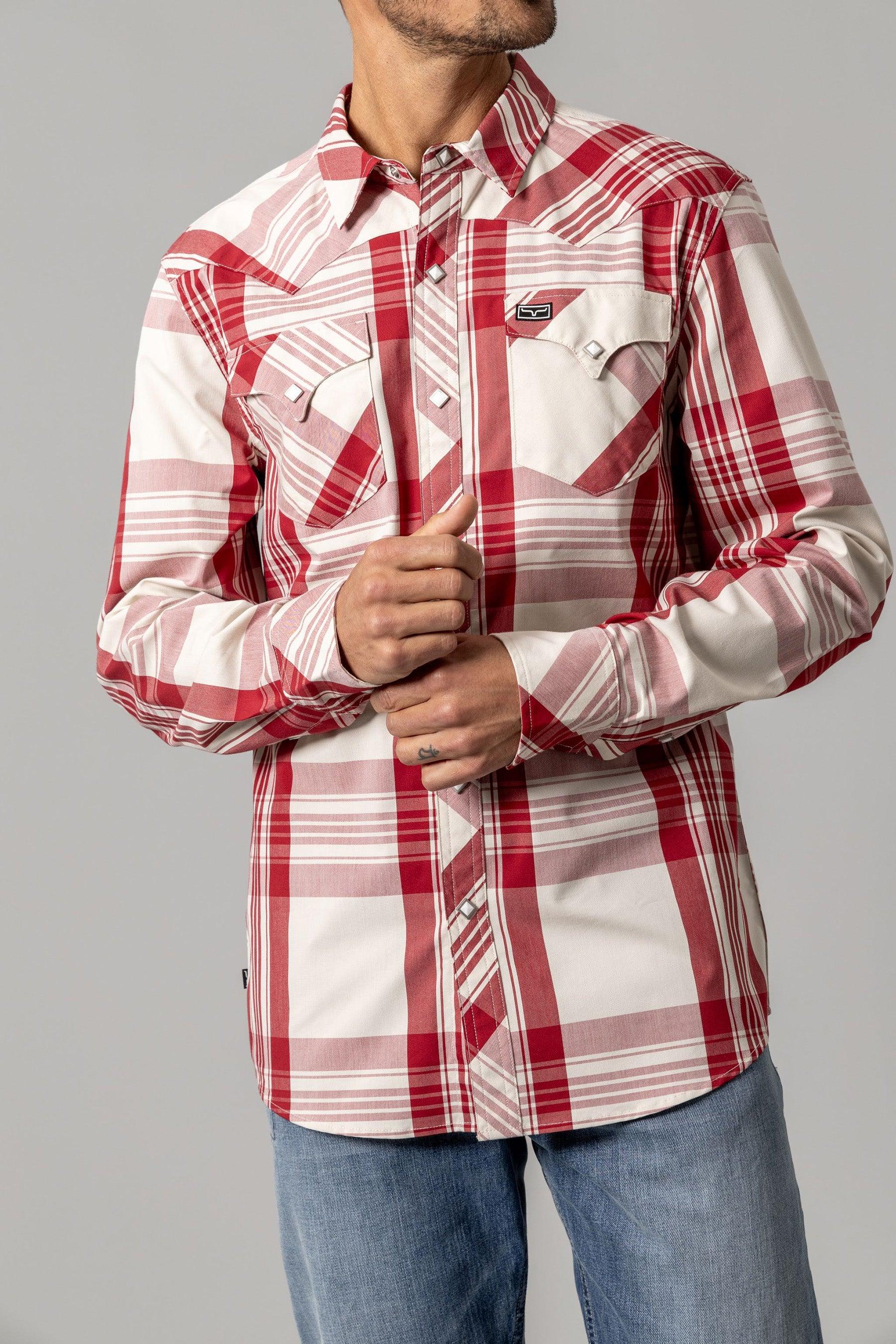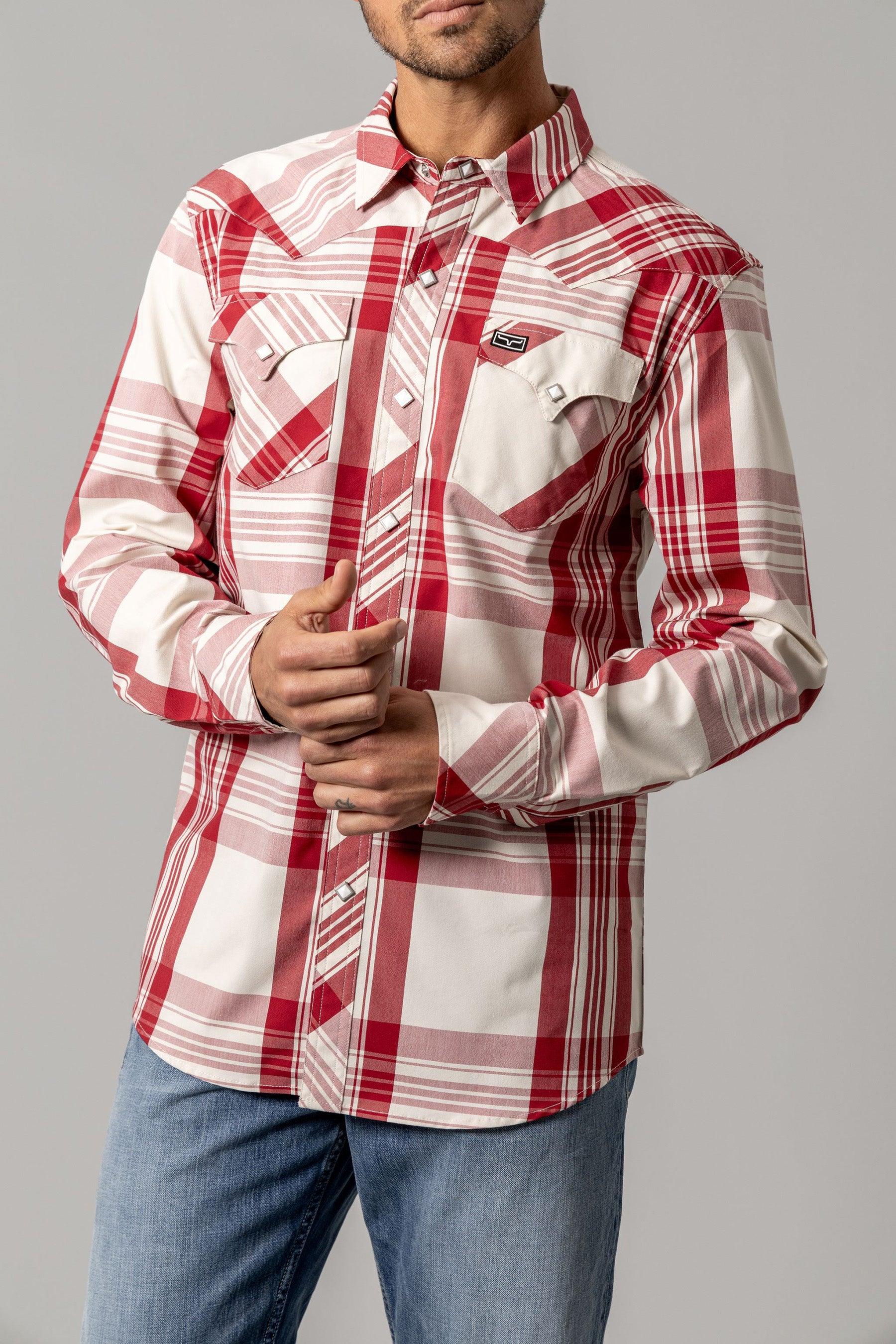 The Double R. Men’s CoolMax long sleeve button-up embraces western elements in classic Kimes Ranch style. Crafted with high-quality. CoolMax technology boasting a contrasting plaid pattern. this long sleeve button up will keep you comfortable. Essential western details include diamond pearl snap buttons. a western style yoke. and vintage-inspired chest pockets. It’s flexible enough to be layered or a stand-alone fit.