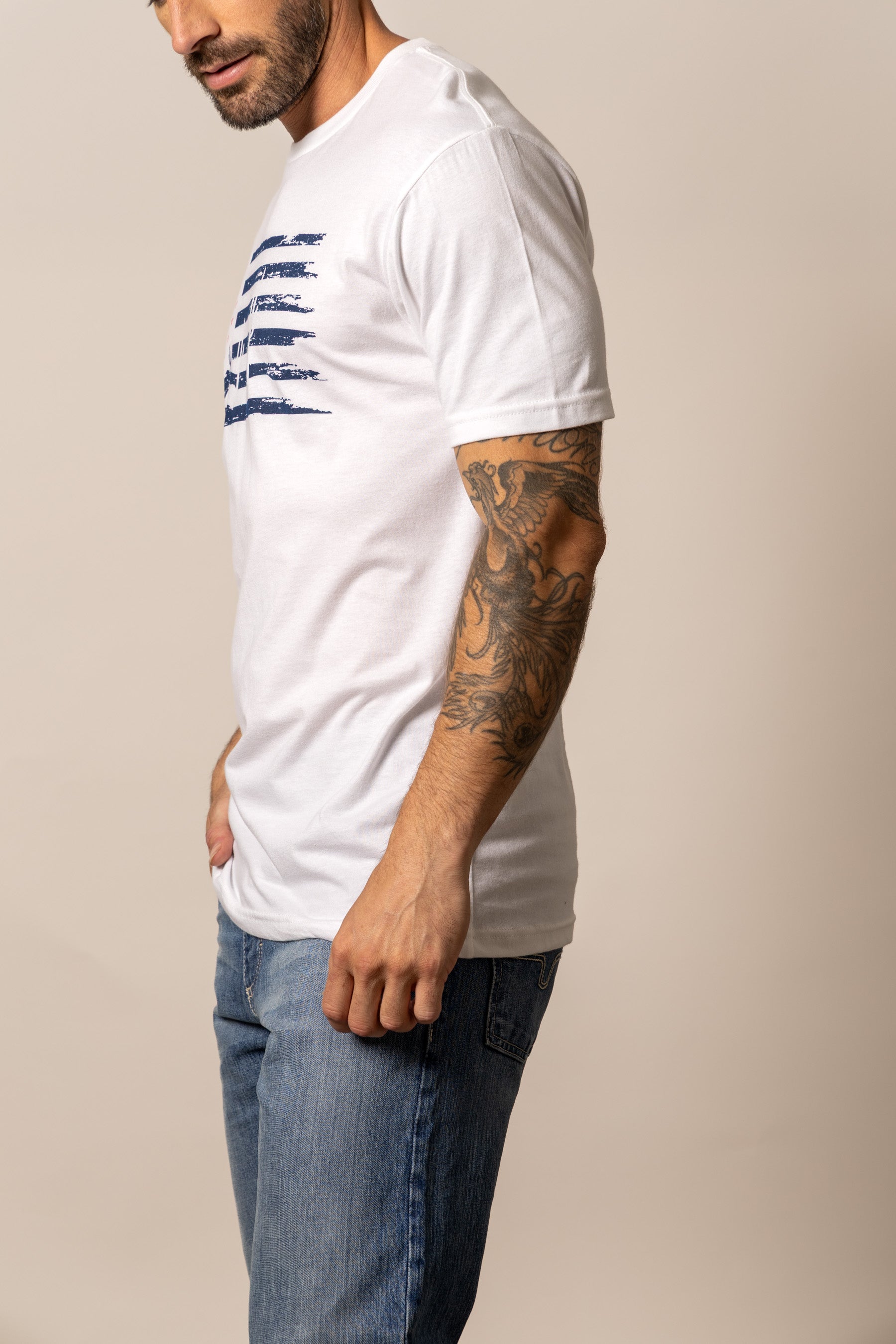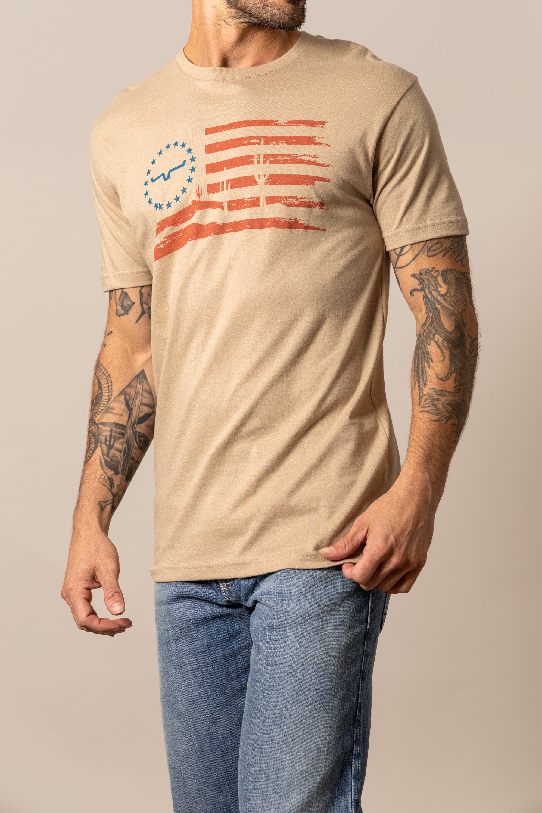 Rooted in the Southwest. This tee features a faded American flag over a rugged desert backdrop—a tribute to the land we call home. Inspired by our Arizona roots. it blends patriotism with the raw beauty of the desert landscape. With its vintage feel and lived-in comfort. it’s made for those who ride with pride. from the ranch to the rodeo.