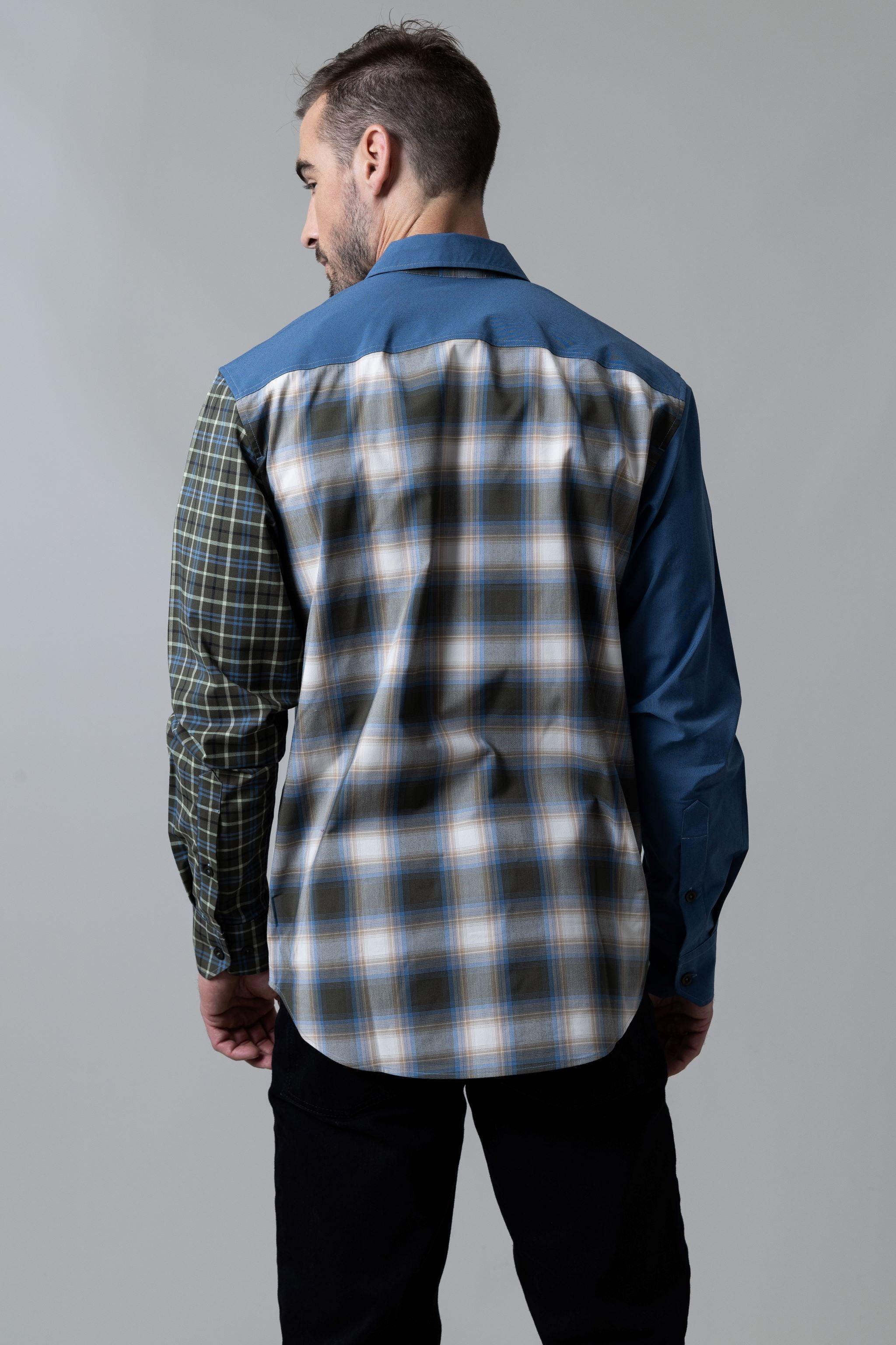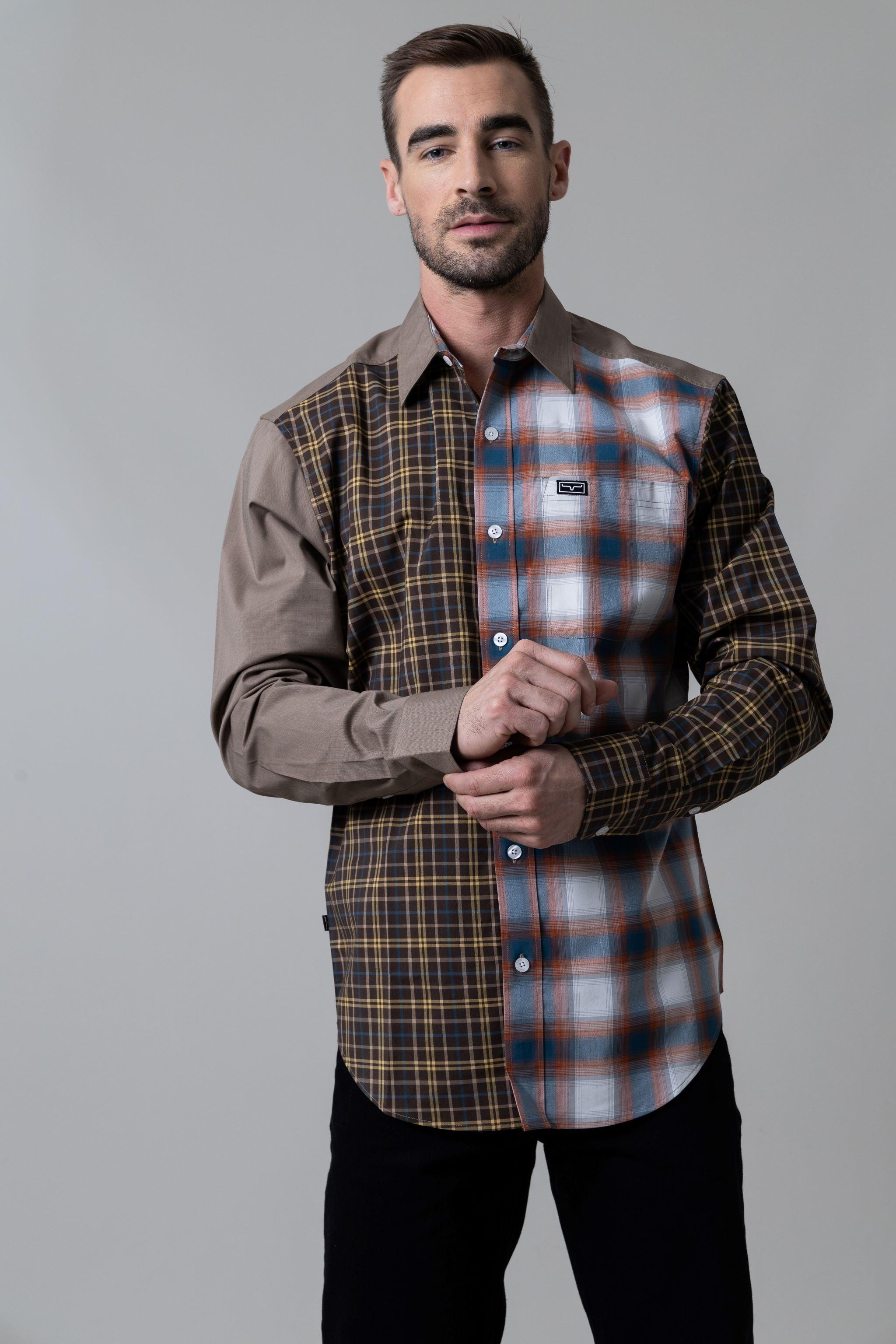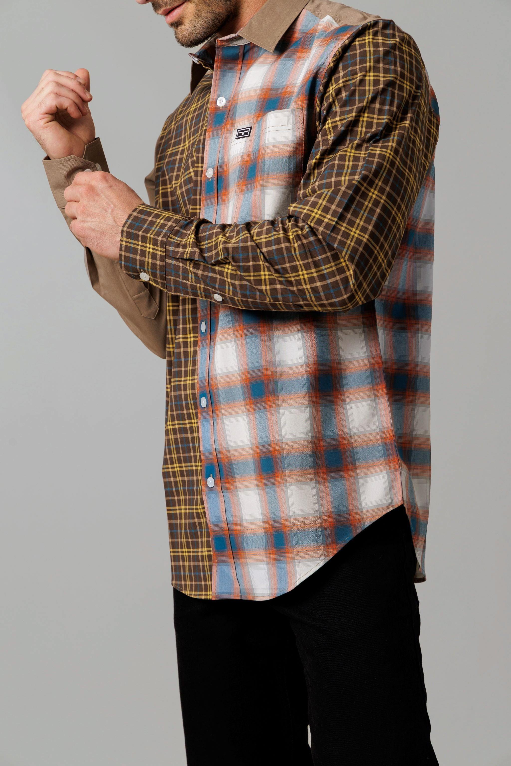 This shirt features a captivating mix of prints and plaid. creating a one-of-a-kind look