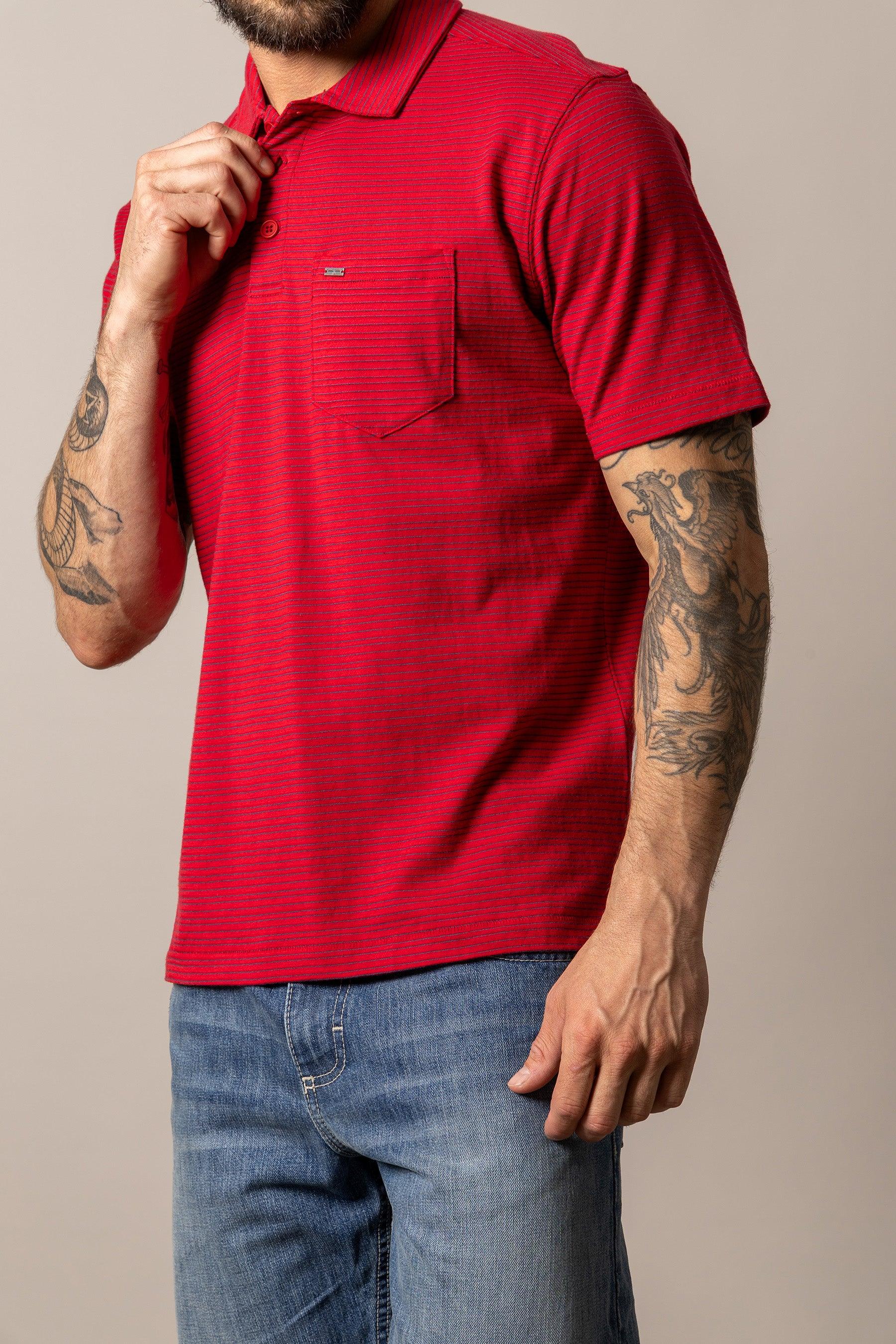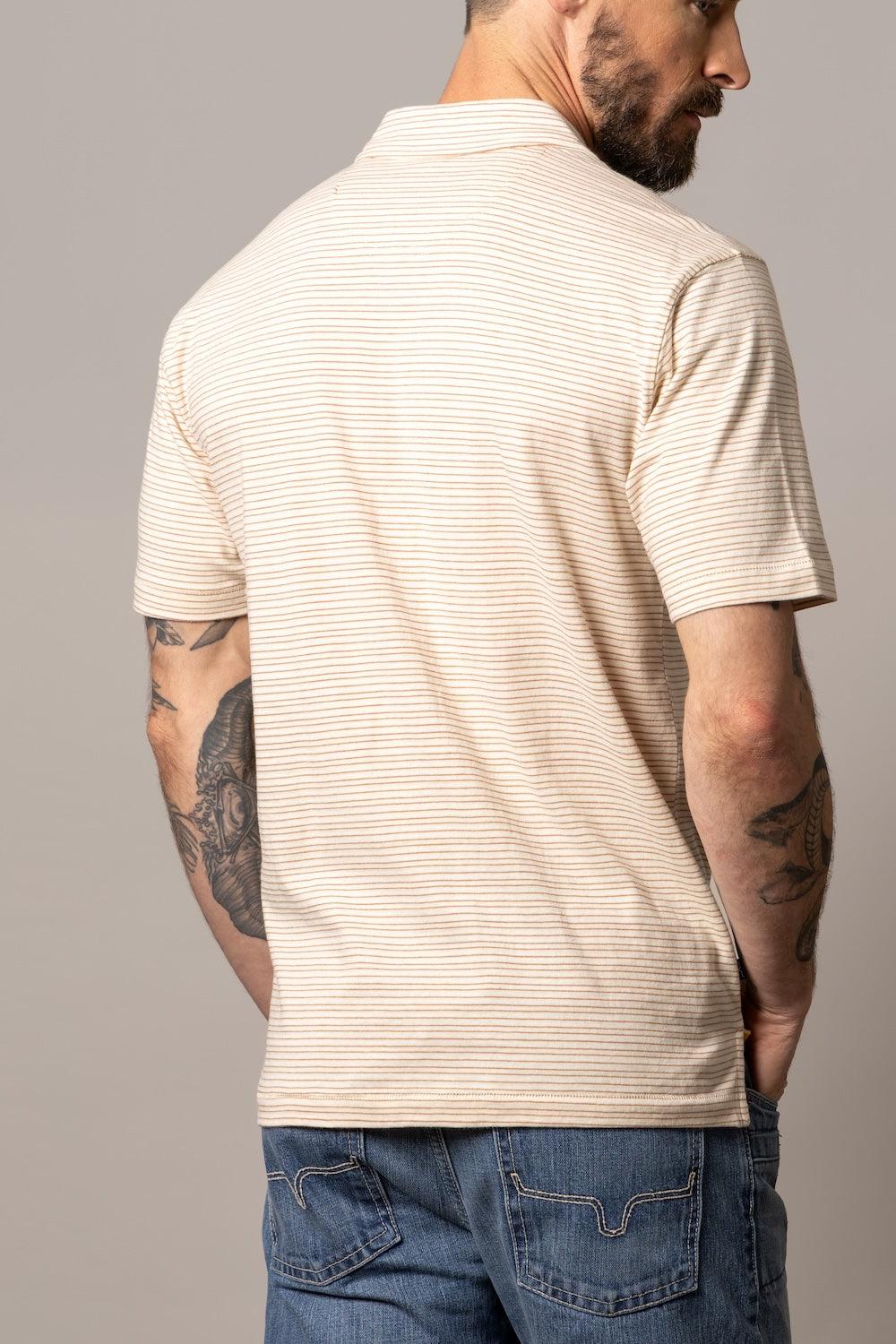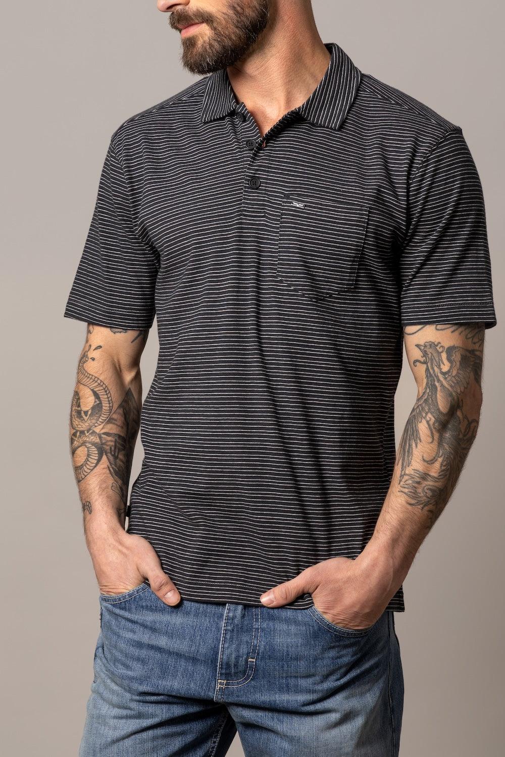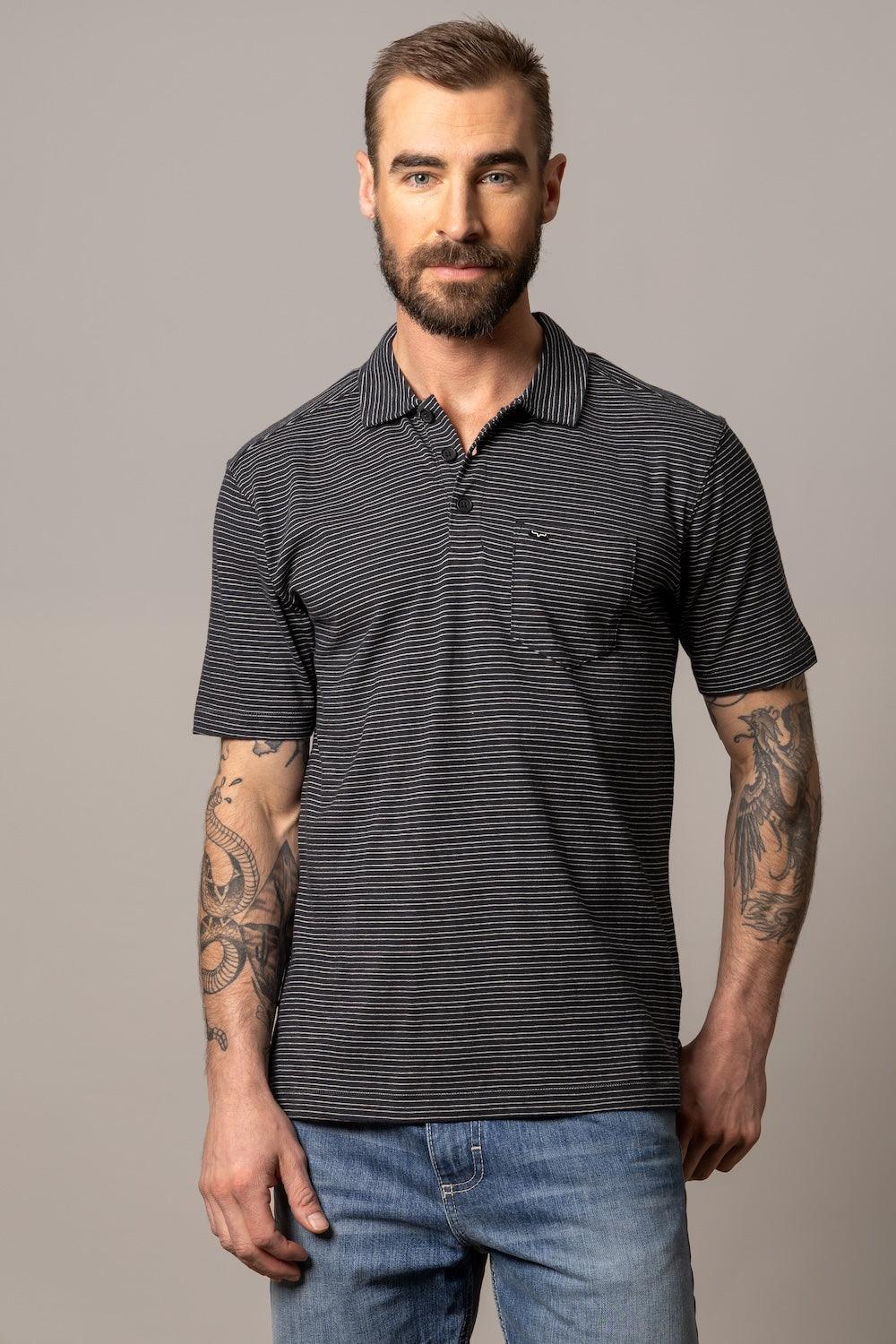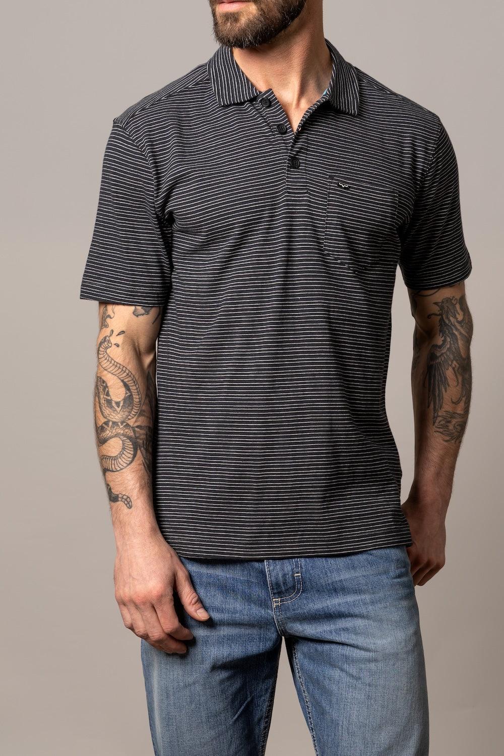 The Harlan shows off a striped pattern across comfortable. organic cotton. The open chest pocket at the front keeps essentials at hand. and the triple button neckline and double-row stitching ensure security. This polo can be worn for any occasion.