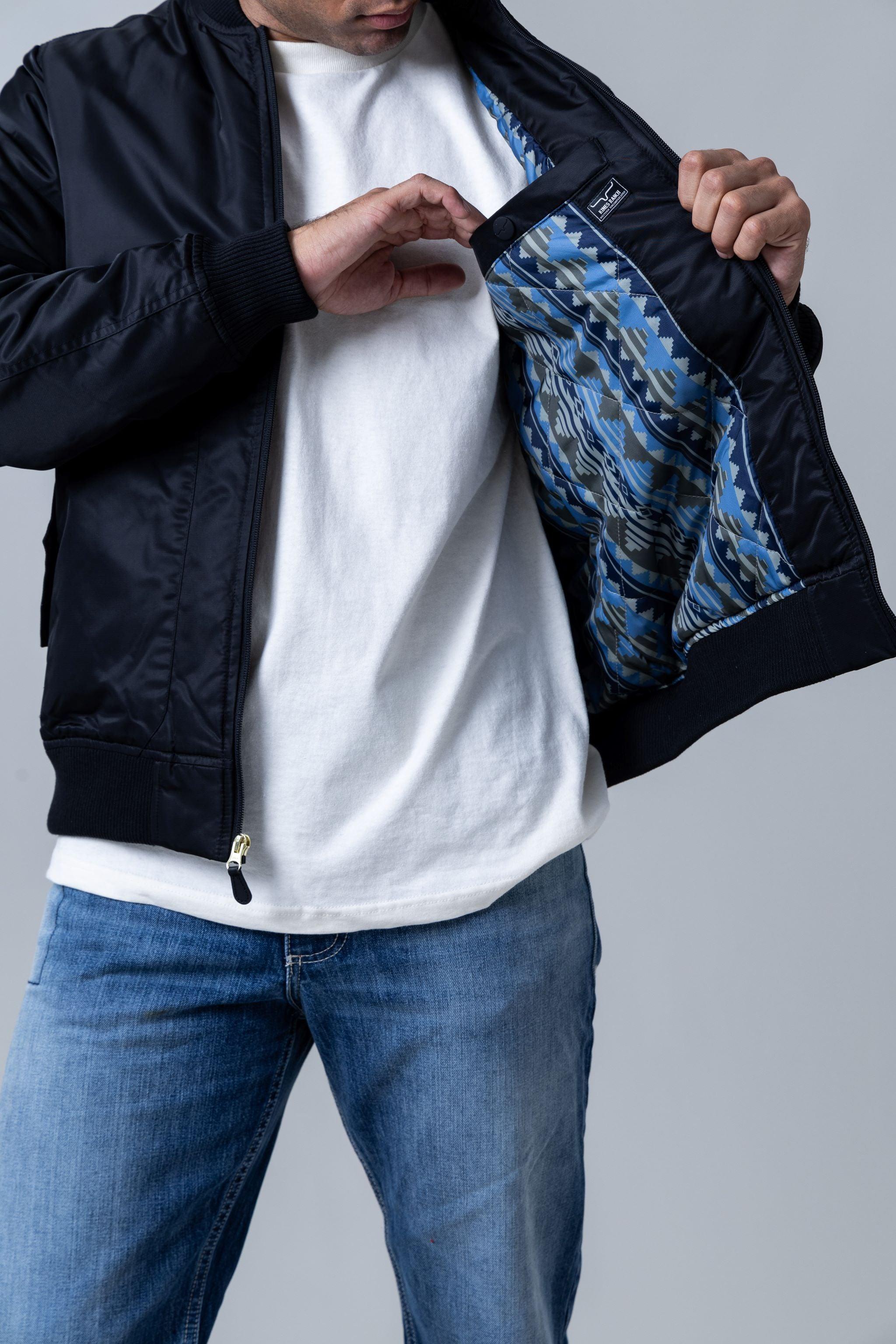 A classic bomber jacket that combines quality and style. It offers a sleek appearance with a ribbed bottom and a convenient zipper pocket on the sleeve. It’s the perfect choice for a refined and contemporary look.