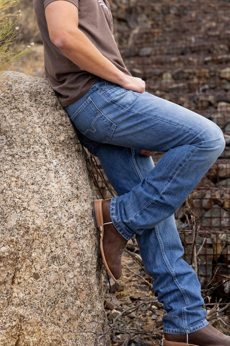 The James features a lower rise with a straight fit and straight boot leg in an wear-every-day Mid Wash. An integrated knife pocket and light stitching perfectly accent these traditional jeans.