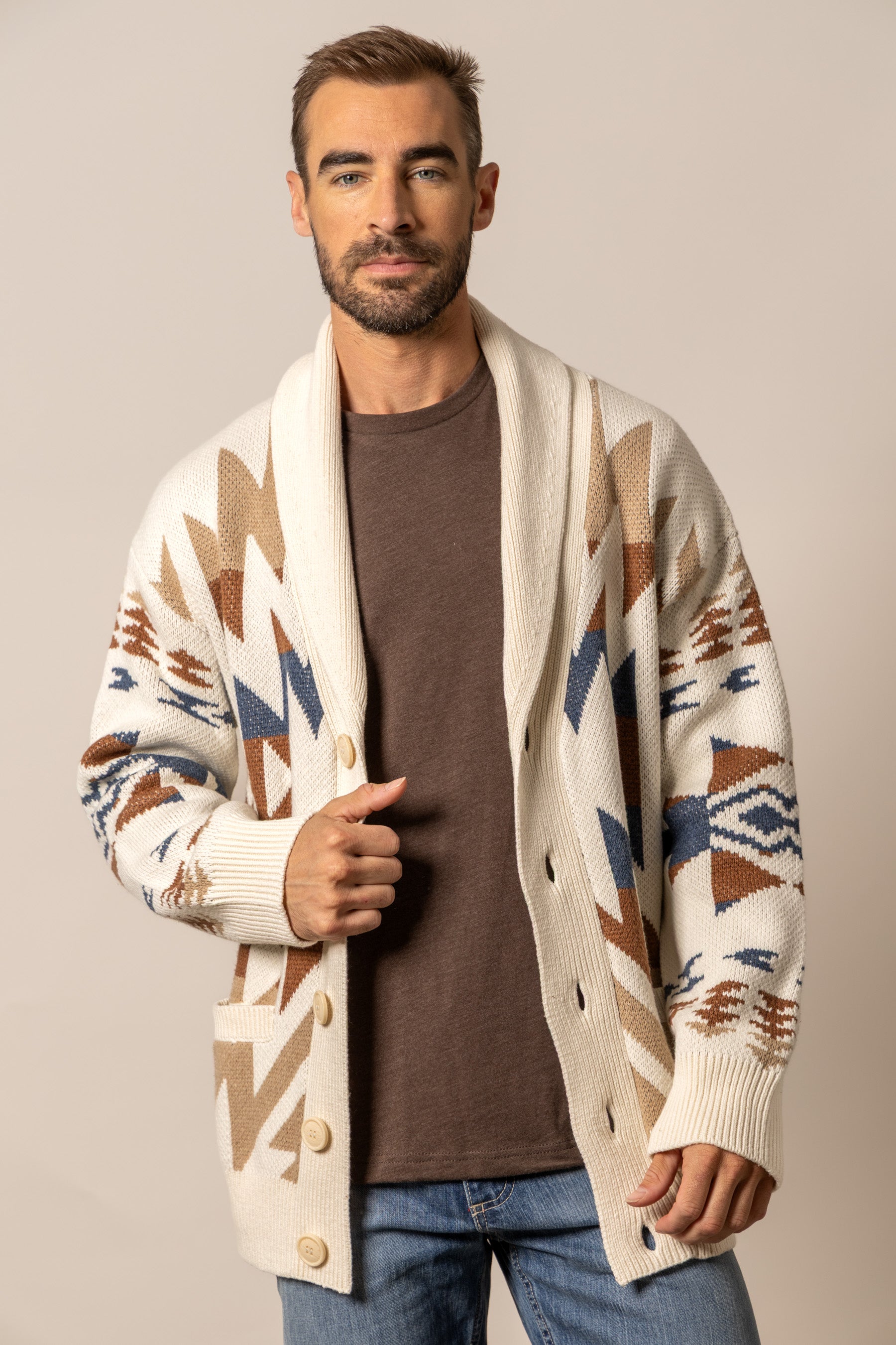 The Knox cardigan combines timeless craftsmanship with bold Western heritage. Featuring a striking Southwestern-inspired pattern. this cardigan is knit from a soft yet durable blend designed for warmth and comfort. A button-front closure and relaxed fit make it easy to layer over your favorite tee or denim shirt. while ribbed cuffs and hem ensure lasting shape. Equal parts rugged and refined. it’s the statement layer that transitions effortlessly from chilly mornings on the ranch to evenings in town.