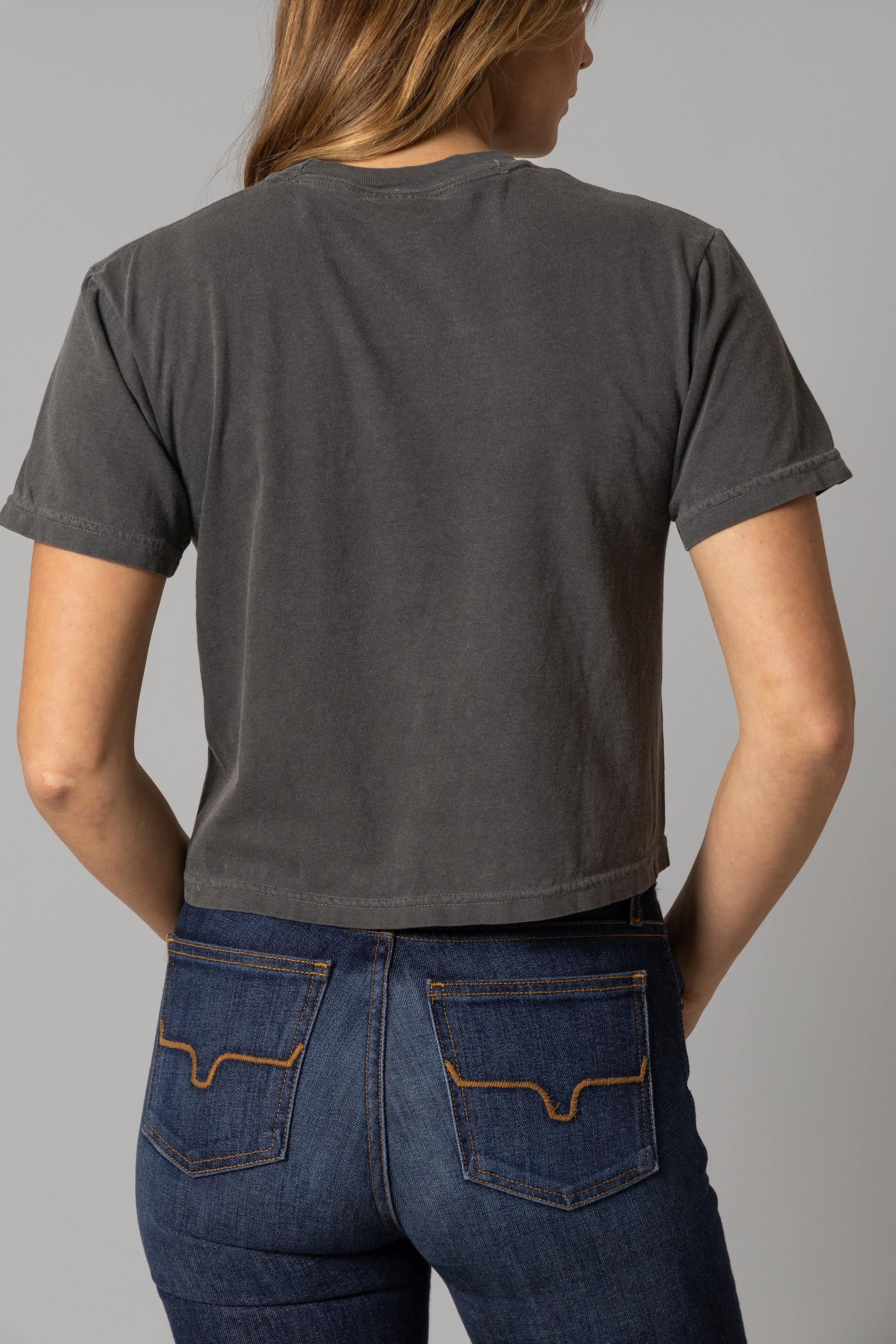 This cropped crew neck features an eye-catching graphic: a bold American flag design reimagined in a circle. and the iconic Kimes Ranch longhorn logo proudly takes center stage within the flag. showcasing love for both country and ranch life. Made from a soft. lightweight fabric. this patriotic cropped tee is perfect for the hotter months.
