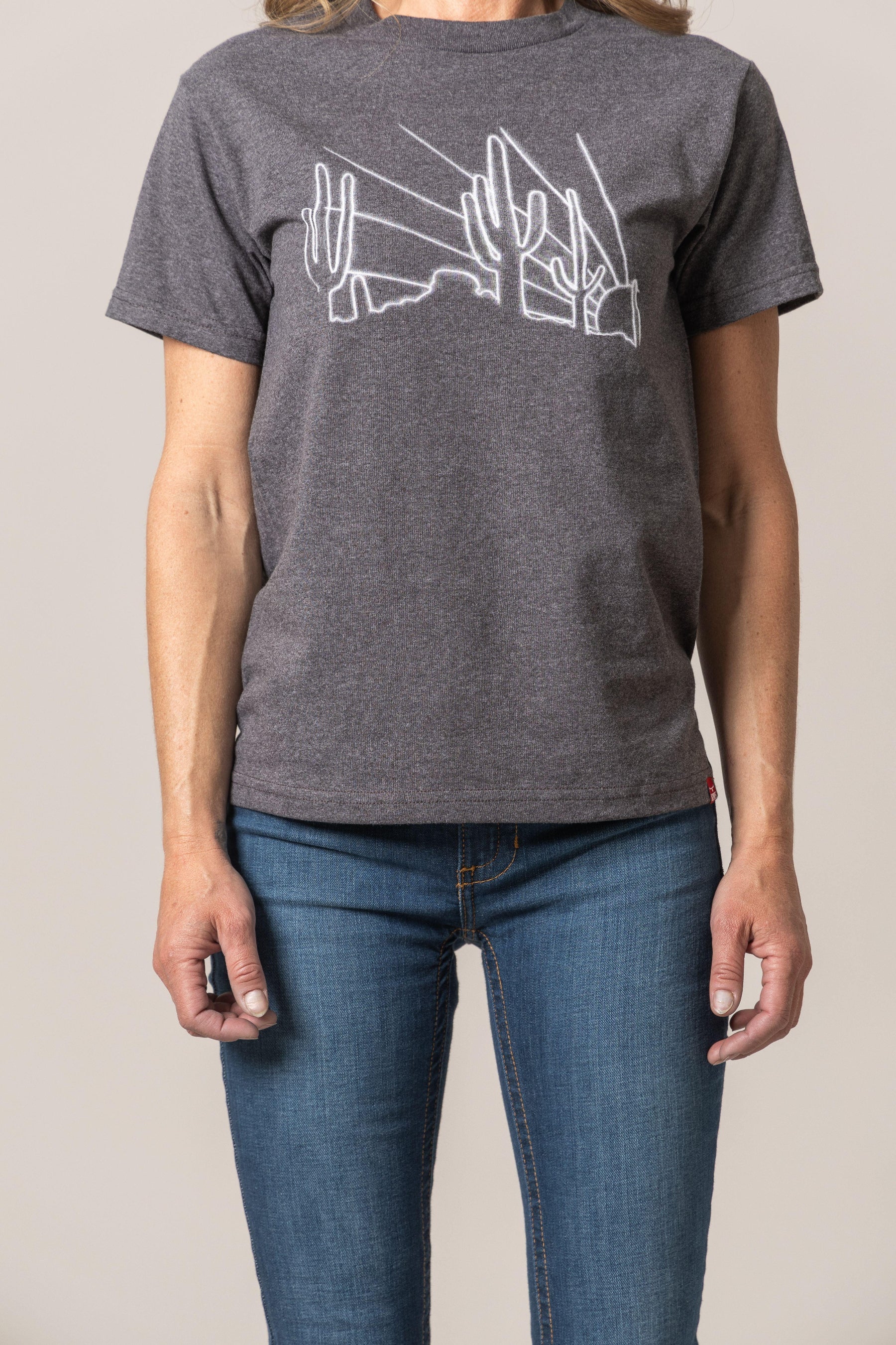 This crew neck features a single-line drawing of a quintessential Arizona desert scene on the front. capturing the stark beauty of the landscape. The iconic Kimes Ranch longhorn logo adorns the back top of the shoulder. adding a subtle brand touch. This cotton graphic tee is perfect for the modern minimalist to wear anywhere. anytime.