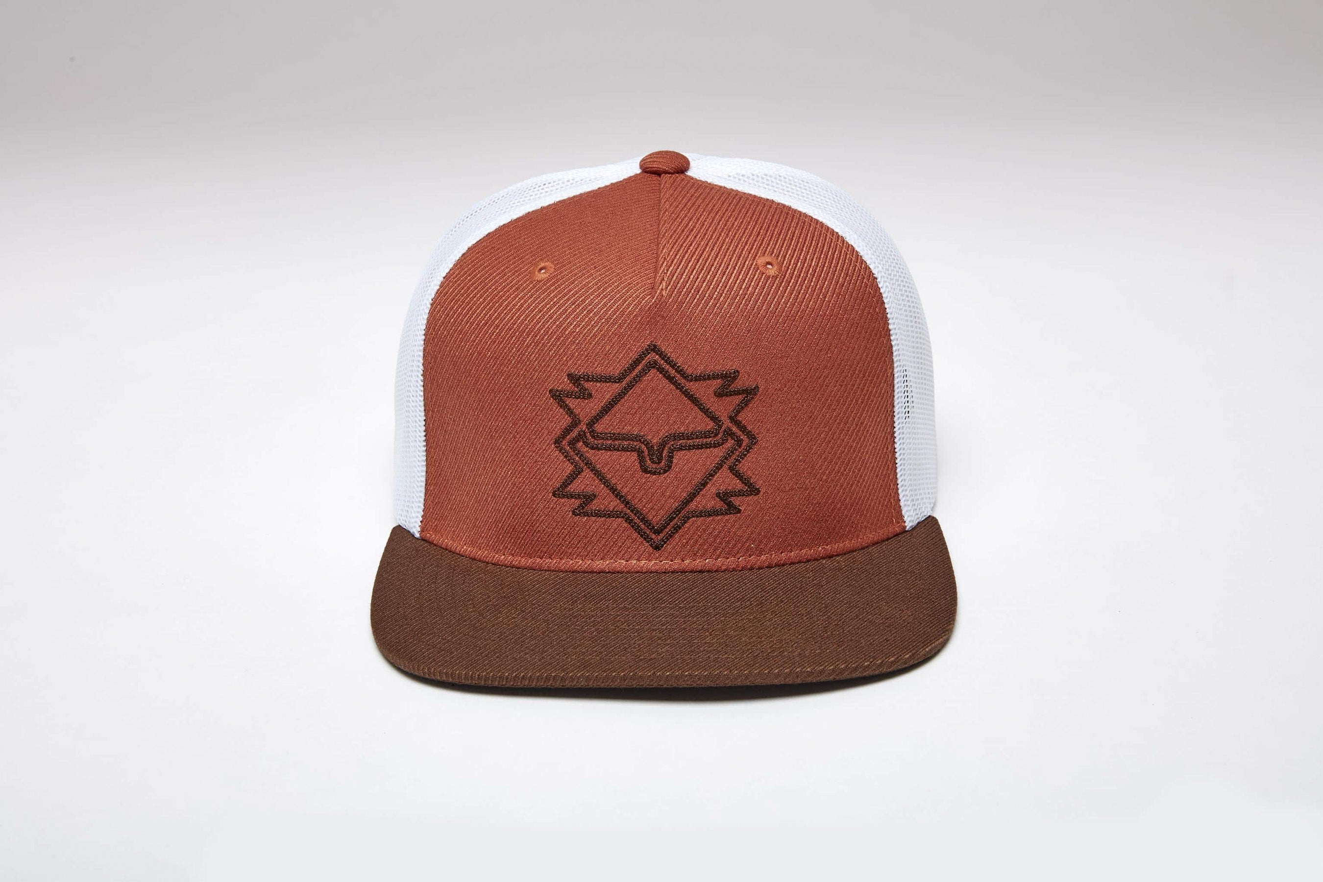 The North Star Hat captures Western heritage through a modern lens. This structured 5-panel ranch hat is crafted from durable twill and designed with a high-profile fit and flat bill for clean. confident style. Flat chain stitch embroidery brings a bold Southwestern-inspired Kimes Ranch design to the front. celebrating classic craftsmanship with a contemporary edge.