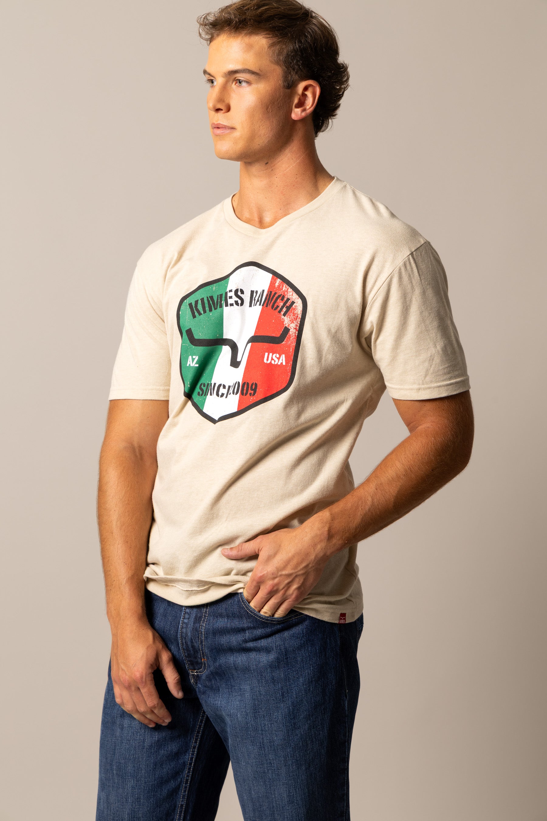 The Triple Stripe Tee celebrates Western heritage and Mexican pride in true Kimes Ranch style. Featuring the iconic horn logo set against the bold green. white. and red stripes of the Mexican flag. this tee makes a statement of unity and strength. Crafted from a soft cotton-poly blend. it delivers all-day comfort and durability — perfect for days on the ranch. at the arena. or out in town.