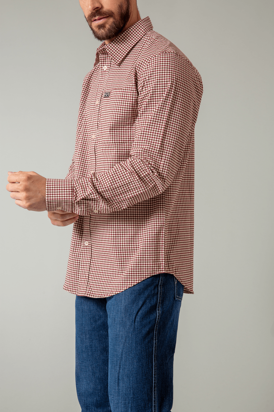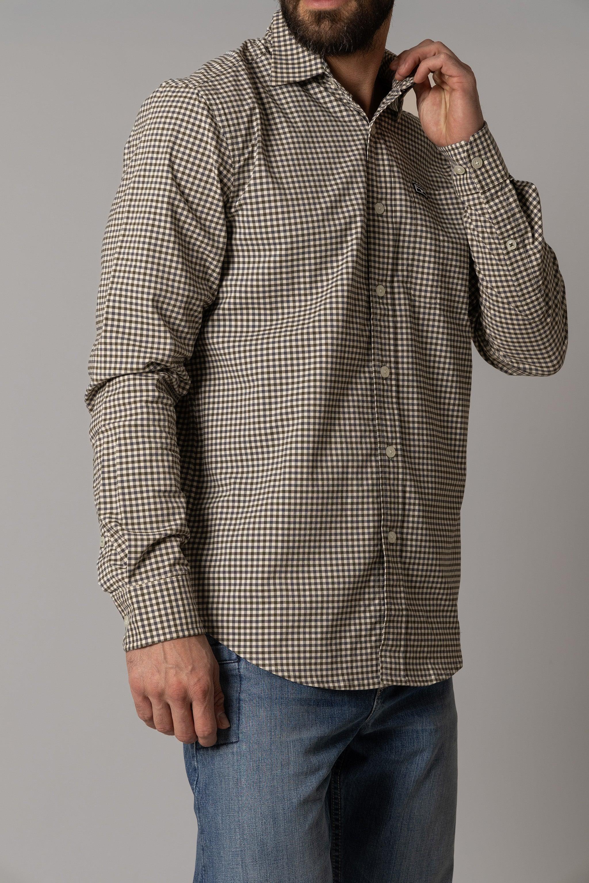 DetailsMen’s Long Sleeve Woven Mini-Check Shirt in Technical Coolmax Fabric. Single Pocket. and Tech Patch on Pocket.